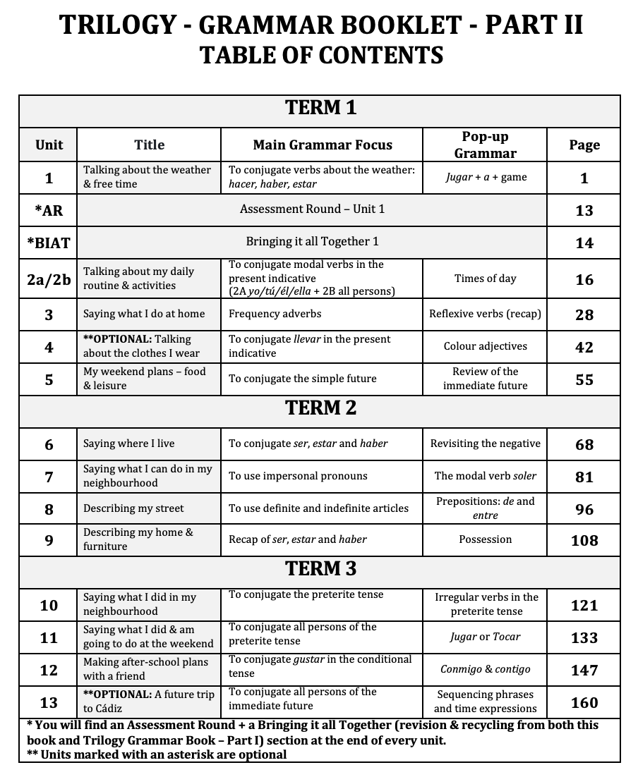 This book was conceived as a supplement to our Spanish Sentence Builders: Trilogy – Part II book. It is divided into 13 units, with matching Sentence Builders from the main Trilogy book. Each of the units is based around one Main Grammar Focus, which is explained and then taught via an array of engaging Conti, EPI, vocab building, translation and writing tasks. There are also additional Pop-up Grammar sections to introduce and teach other grammatical points required throughout the book.