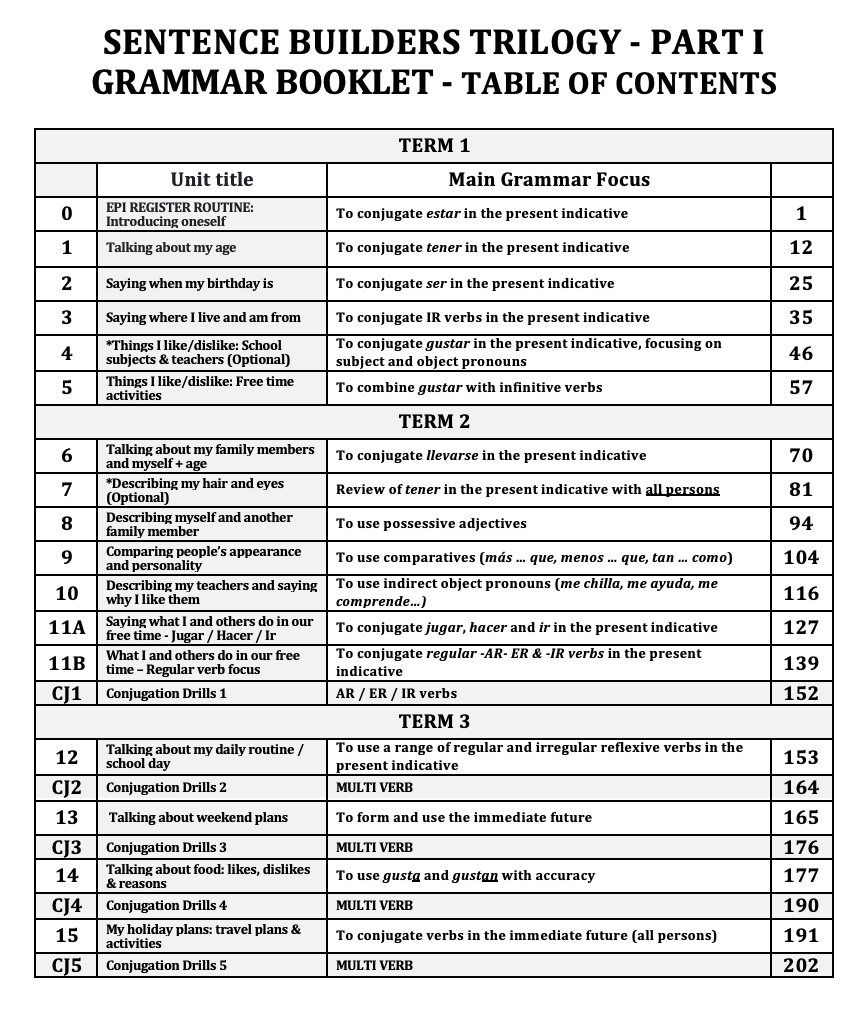 This book was conceived as a supplement to our Spanish Sentence Builders: Trilogy – Part I book. It is divided into 15 units, with matching Sentence Builders from the main Trilogy book. Each of the units is based around one Main Grammar Focus, which is explained and then taught via an array of engaging Conti, EPI, vocab building, translation and writing tasks. There are also additional Pop-up Grammar sections to introduce and teach other grammatical points required throughout the book.
