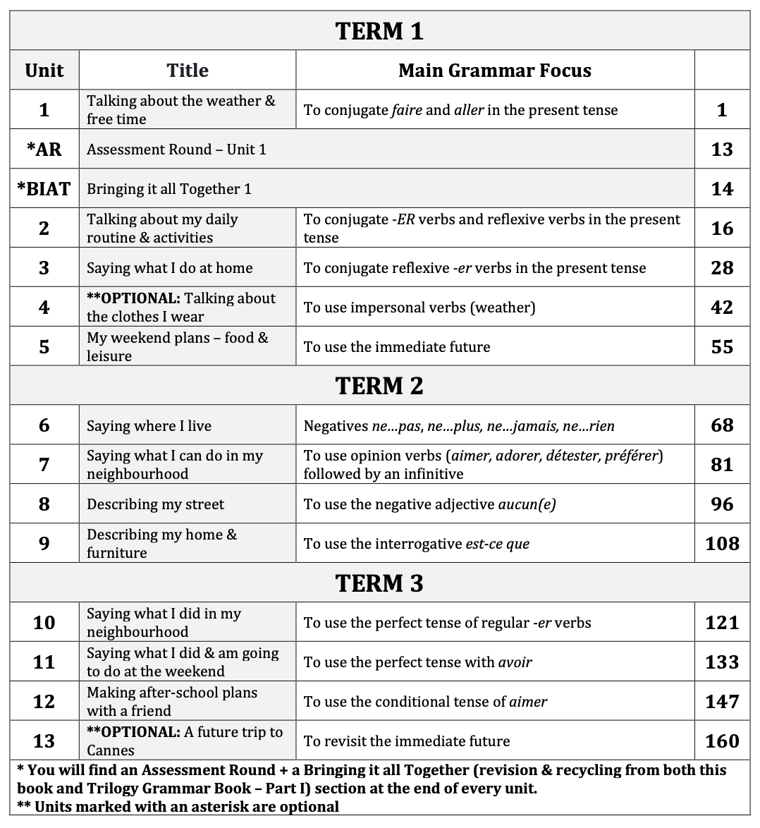 This book was conceived as a supplement to our French Sentence Builders: Trilogy – Part II book. It is divided into 13 units, with matching Sentence Builders from the main Trilogy book. Each of the units is based around one Main Grammar Focus, which is explained and then taught via an array of engaging Conti, EPI, vocab building, translation and writing tasks. There are also additional Pop-up Grammar sections to introduce and teach other grammatical points required throughout the book.