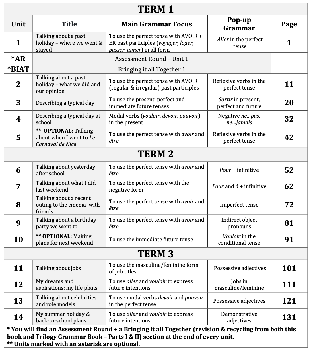 This book was conceived as a supplement to our French Sentence Builders: Trilogy – Part III book. It is divided into 14 units, with matching Sentence Builders from the main Trilogy book. Each of the units is based around one Main Grammar Focus, which is explained and then taught via an array of engaging Conti, EPI, vocab building, translation and writing tasks. There are also additional Pop-up Grammar sections to introduce and teach other grammatical points required throughout the book.